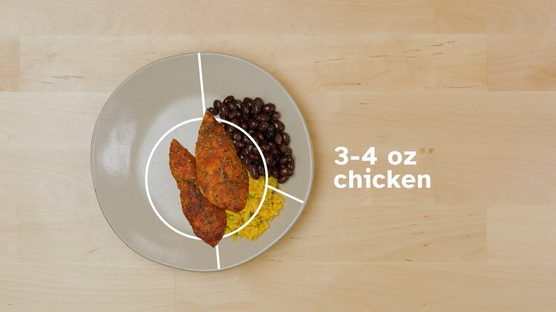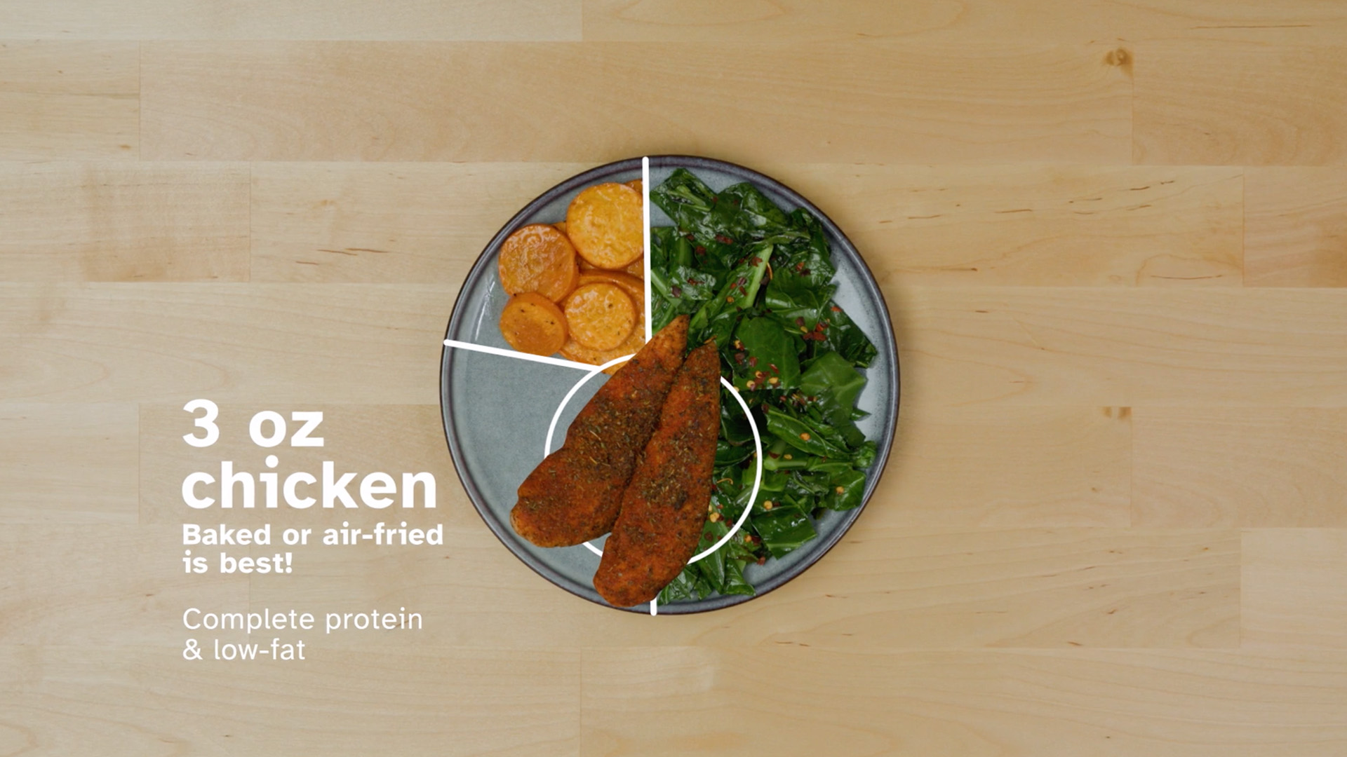 Season chicken with salt, pepper, garlic powder, smoked paprika and oregano. Bake or air fry until fully cooked (internal temp 165°F). Then add 3–4 ounces to your plate.