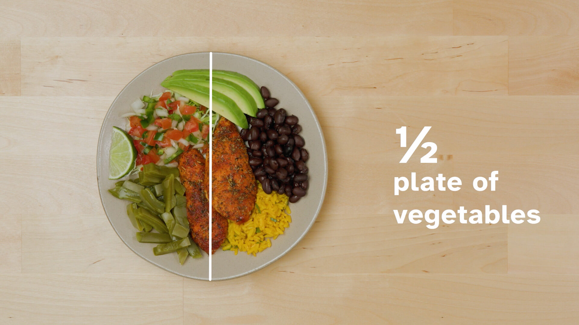 Aim for a 1/2 plate of vegetables. Here we’ve layered chopped cabbage, steamed nopales and pico de gallo. We topped with about ⅓ of an avocado for healthy fats. Mix in other vegetables you enjoy for added nutrients and color.