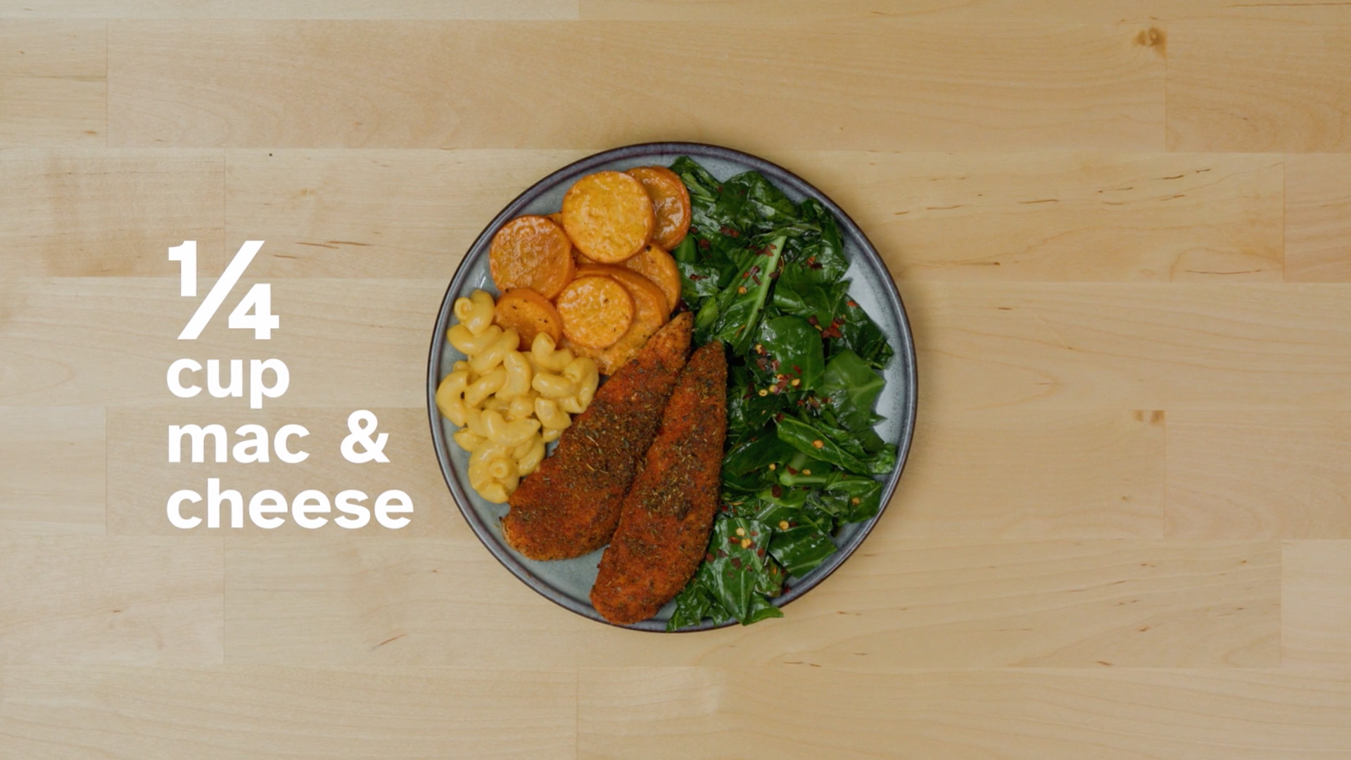 Add ½ cup of cooked yams. Prepare by steaming, baking, boiling or air frying. Avoid adding butter, sugar or excess salt. Include ¼ cup of macaroni and cheese to your plate.