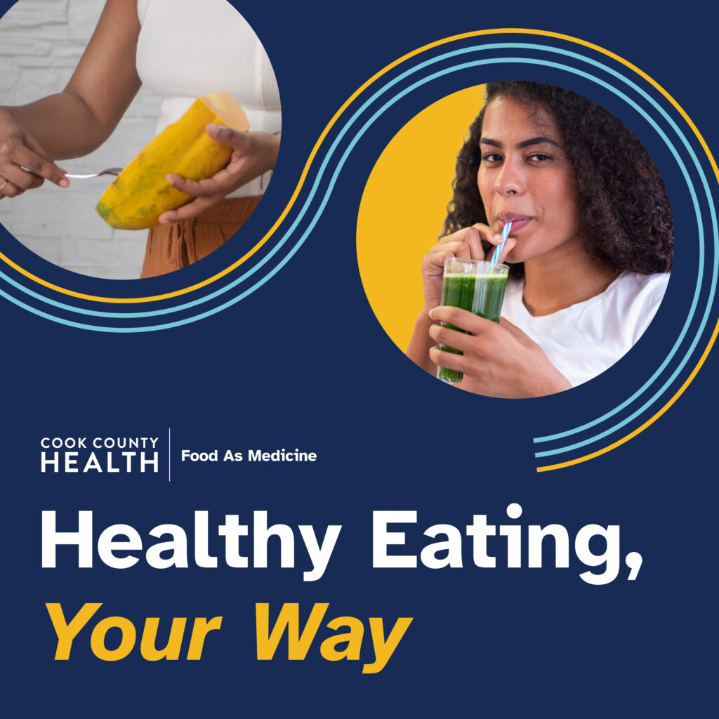 Caption: There is more than one path to a healthy lifestyle. Available to Cook County Health patients, our “Food As Medicine” program connects patients to food resources that support long-term wellnessLearn more at cookcountyhealth.org/food-as-medicine