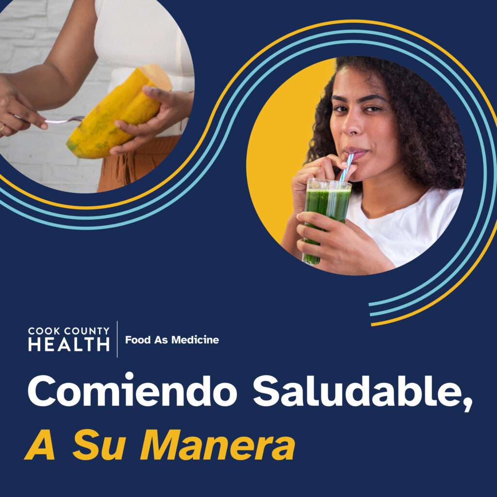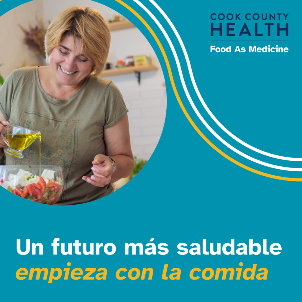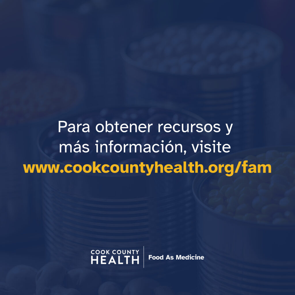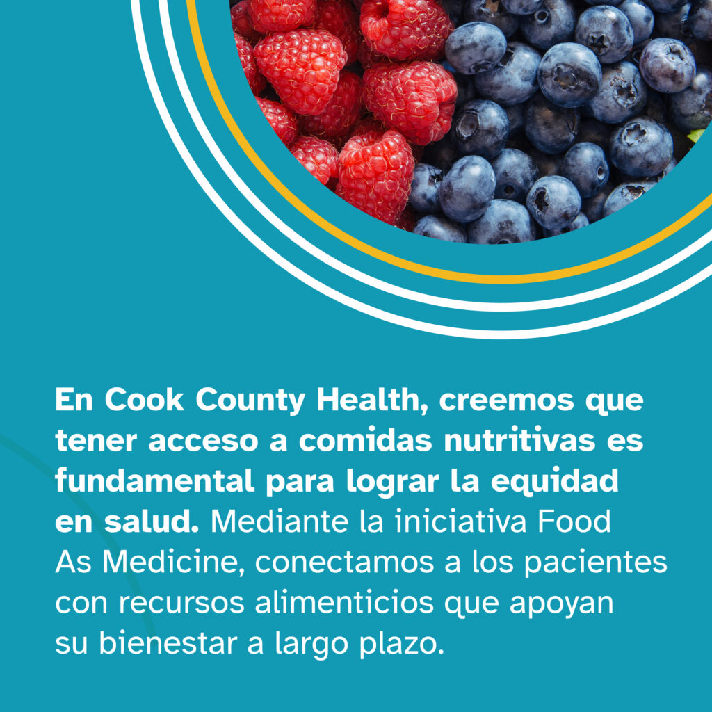 Caption: Creemos que la salud comienza con la alimentación. Nuestra iniciativa Food As Medicine se dedica a garantizar que los pacientes de Cook County Health tengan acceso a los recursos que necesitan para prosperar. Consideramos que esto es fundamental para lograr la equidad en salud, al vincular la alimentación con resultados de salud positivos. Obten más información en cookcountyhealth.org/es/fam.