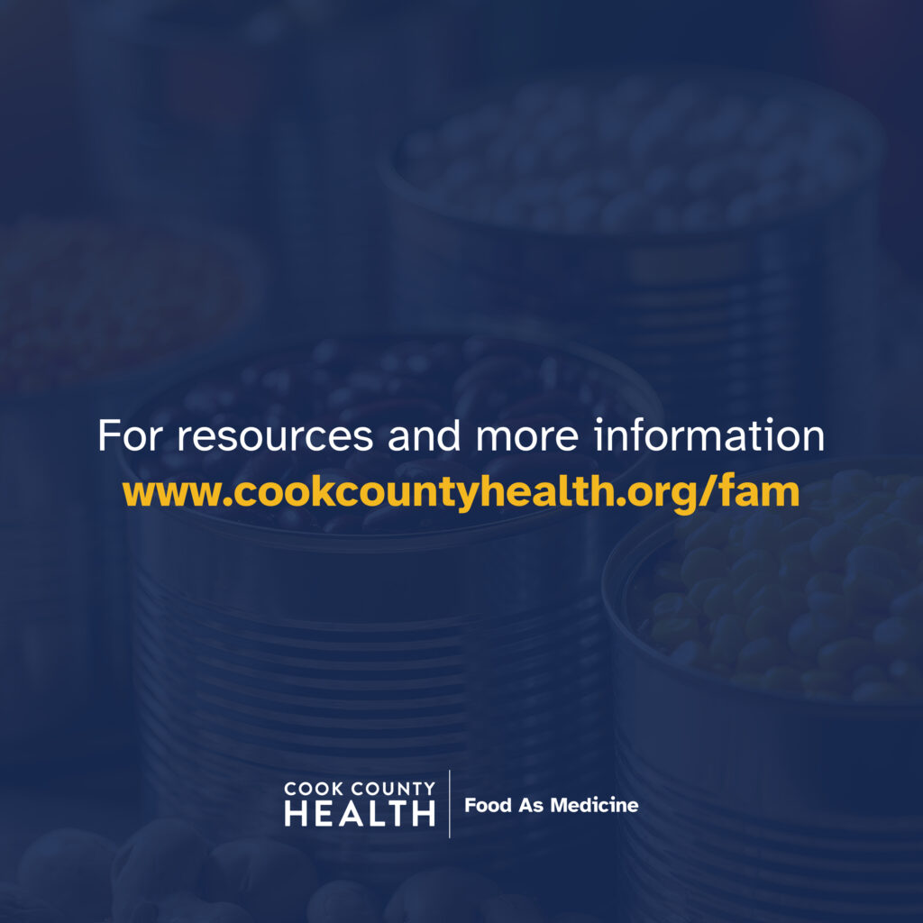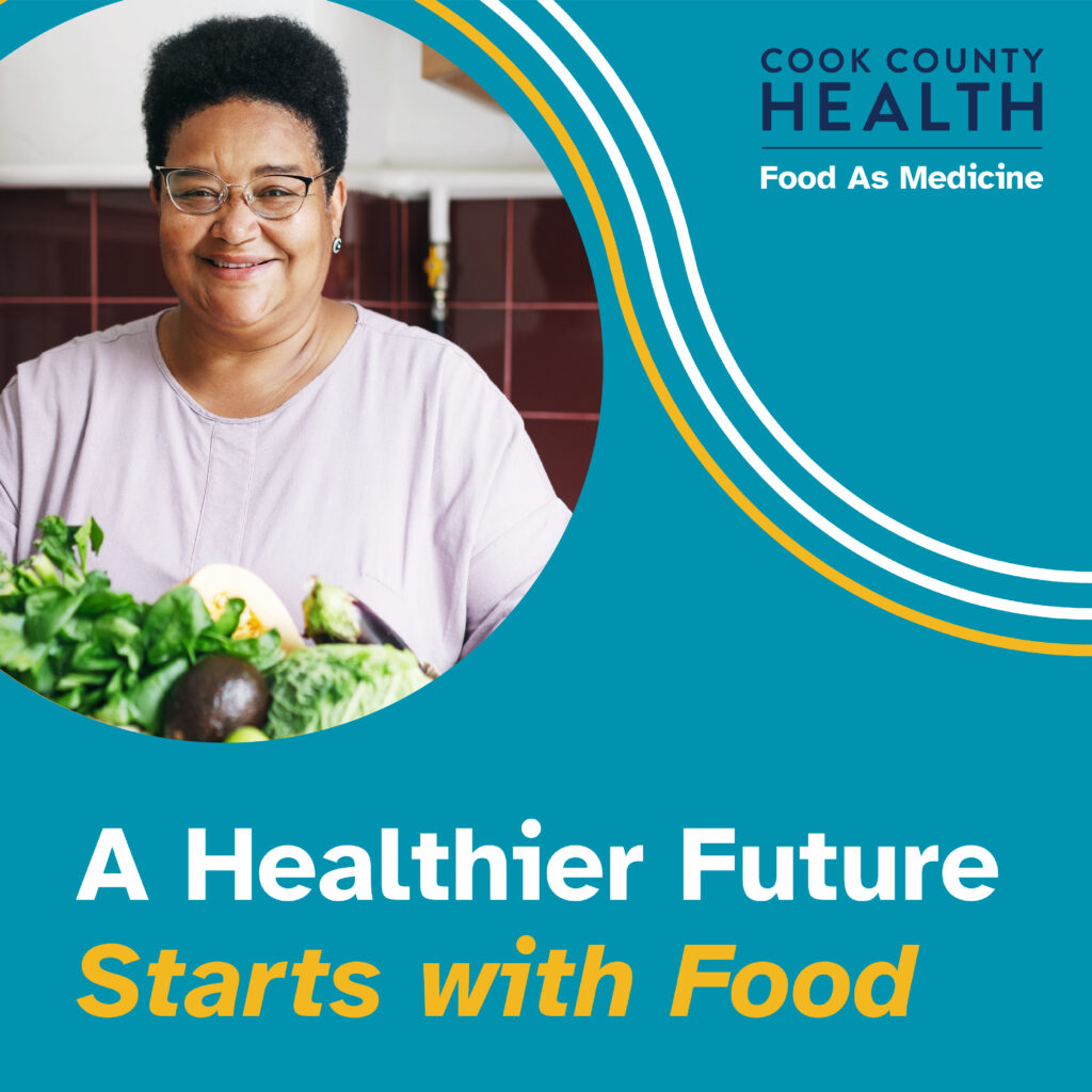 Caption: We believe health starts with food. Our “Food As Medicine” initiative is dedicated to ensuring Cook County Health patients have access to nutritious resources they need to thrive. We see this as a direct link to achieving health equity—connecting food to positive health outcomes. Learn more at cookcountyhealth.org/food-as-medicine